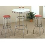 This 3 Piece Bar Table Set by Coaster comes in retro chrome finish and is a contemporary addition for your bar interior. Set includes a round, white top table and two round 29" bar stools. The bar stools feature red cushion upholstery. Let this set bring the real cafe-bar atmosphere into your living environment!